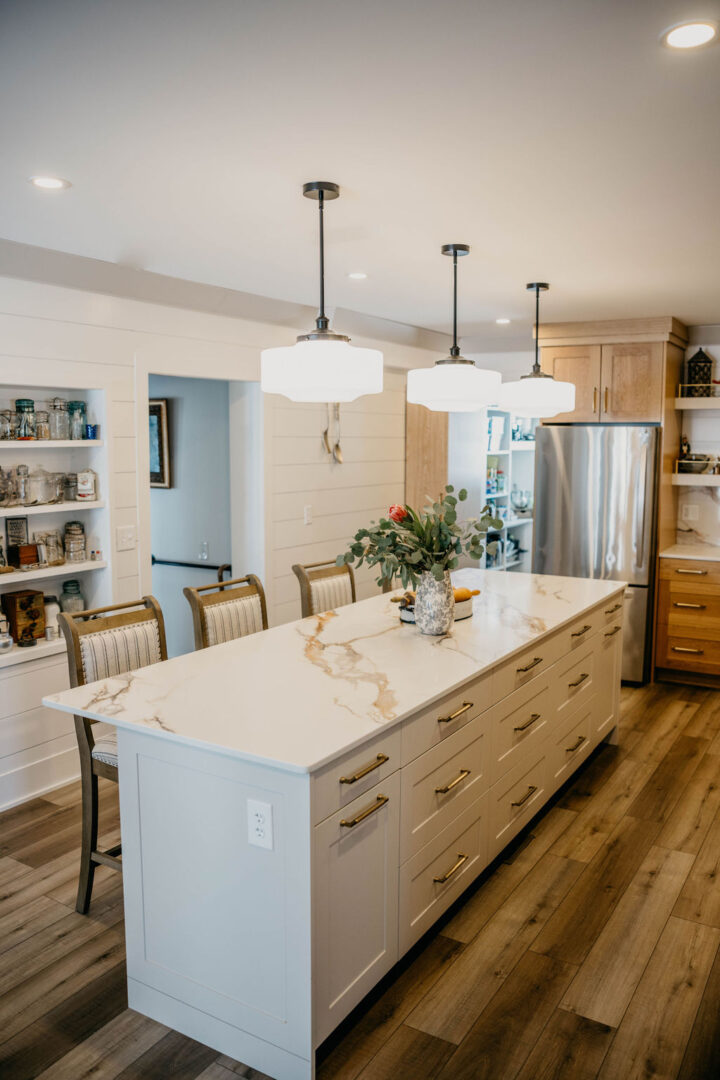 A kitchen with storage and a large island.